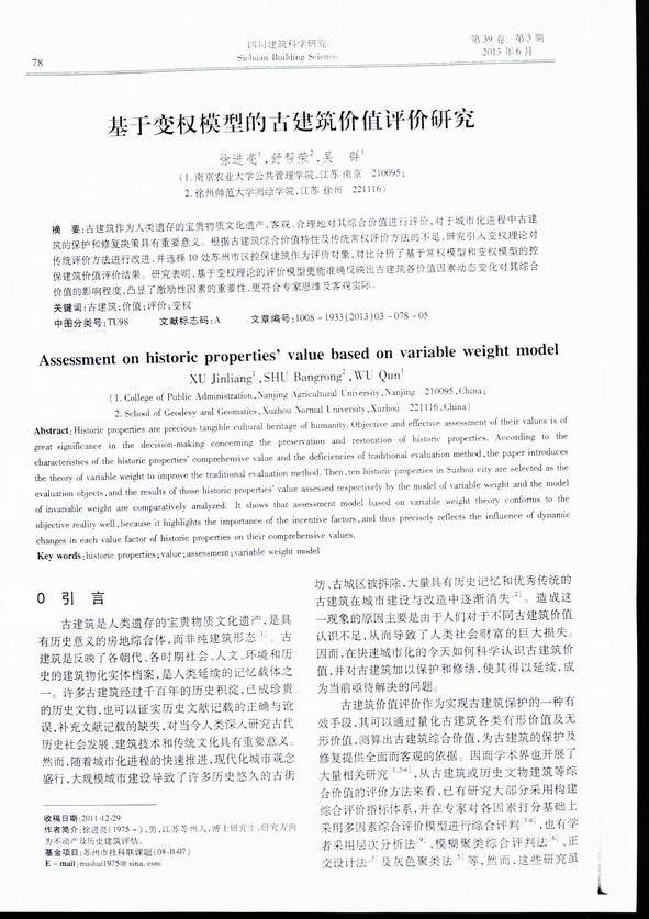 徐进亮博士发表了关于《基于变权模型的古建筑价值评价研究》文章收录于四川建筑科学研究2013年第3期内。