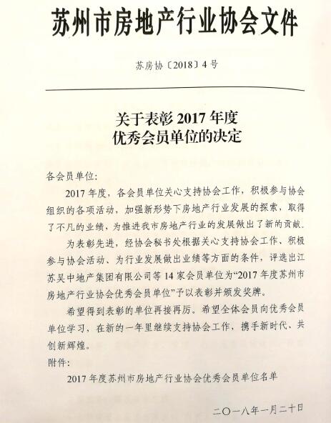公司荣获苏州市房地产行业协会2017年度优秀会员单位。
