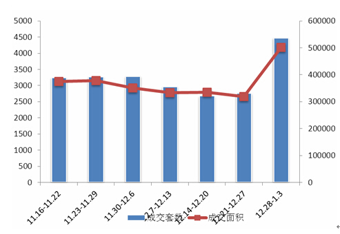 2015.12.28-1.3:本周二手房成交量1658套,较前一周下降543套,跌幅24.67%;成交面积175774.14平方米,较前一周环比下降34.52%,成交量较上周下降明显。