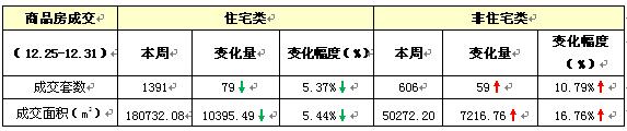 2017.12.25-2017.12.31周二手房成交量1205套,较上周增加19套,上涨1.60%;成交面积140637.72平方米,较上周增加12111.44平方米,上涨9.42%。本周,非住宅成交量121套,较上周减少44套,下跌26.67%;成交面积30027.90平方米,较上周增加6936.88平方米,上涨30.04%。