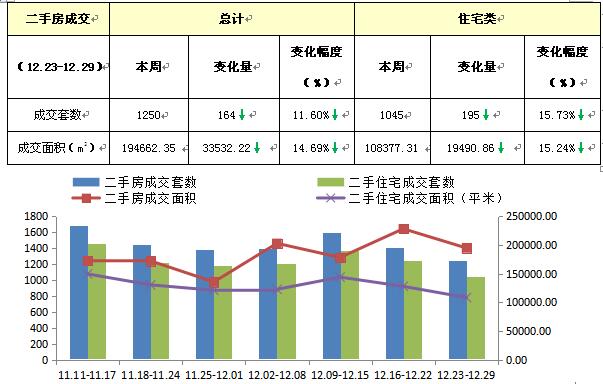 2019.12.23-2019.12.29周苏州市二手房成交总量1250套,较上周减少164套,环比下跌11.60%;成交总面积194662.35平方米,较上周减少33532.22平方米,环比下跌14.69%。本周,住宅成交量1045套,较上周减少195套,环比下跌15.73%;成交面积108377.31平方米,较上周减少19490.86平方米,环比下跌15.24%。其中,住宅总成交面积108377.31㎡,占成交总面积的55.67%。