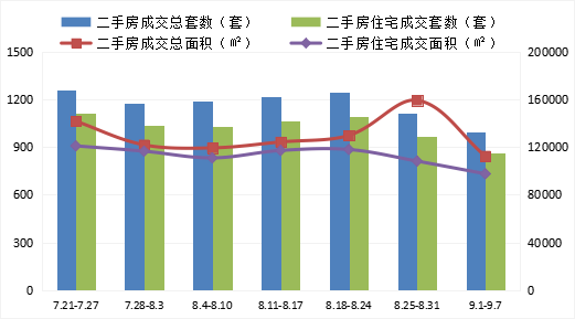 2025.9.1-9.7周苏州市二手房共计成交995套,较上周减少118套,环比下降10.60%;成交总面积112471.92㎡,较上周减少46710.11㎡,环比下降29.34%。本周住宅成交量865套,较上周减少105套,环比下降10.82%;成交面积97583.6㎡,较上周减少10646.56㎡,环比下降9.84%。其中,住宅总成交面积占成交总面积的86.76%。